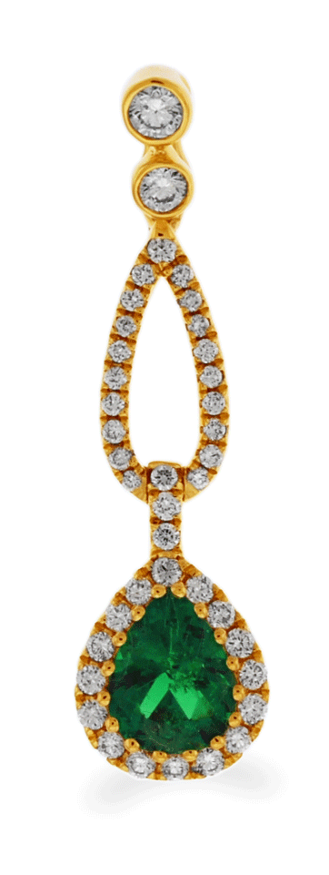 This stunning vivid green emerald pendent is made magnificently from Carnation Designs Signature. It features one pear shaped cut the most radiant green emerald that is surrounding by small round cut brilliant diamonds, dropped down from top with two brilliant round cut diamonds by showing three stones pave set in 18k yellow gold. It will bring you to wear perfectly any wardrobe at any time.