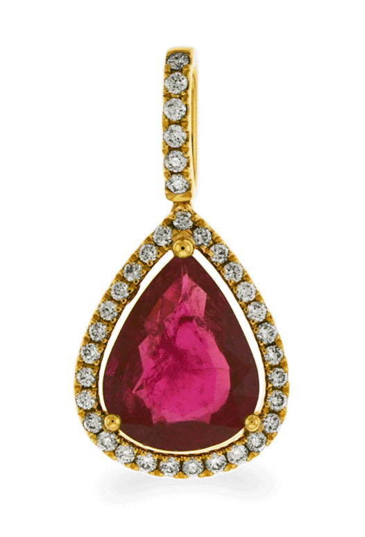 This Carnation Designs Signature pendant features purplish red pear-shaped cut ruby that is surrounded by small round cut brilliant diamonds in 18k yellow gold. You will see the quality of its rich red color and high brilliance. It will bring you to wear at any time with any wardrobe for your unique style.