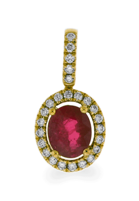 This Carnation Designs Signature pendant features purplish red oval shaped cut ruby that is surrounded by small round cut brilliant diamonds in 18k yellow gold. You will see the quality of its rich red color and high brilliance. It will bring you to wear at any time with any wardrobe for your unique style.
