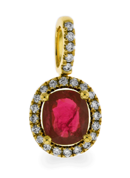 This Carnation Designs Signature pendant features purplish red oval shaped cut ruby that is surrounded by small round cut brilliant diamonds in 18k yellow gold. You will see the quality of its rich red color and high brilliance. It will bring you to wear at any time with any wardrobe for your unique style.