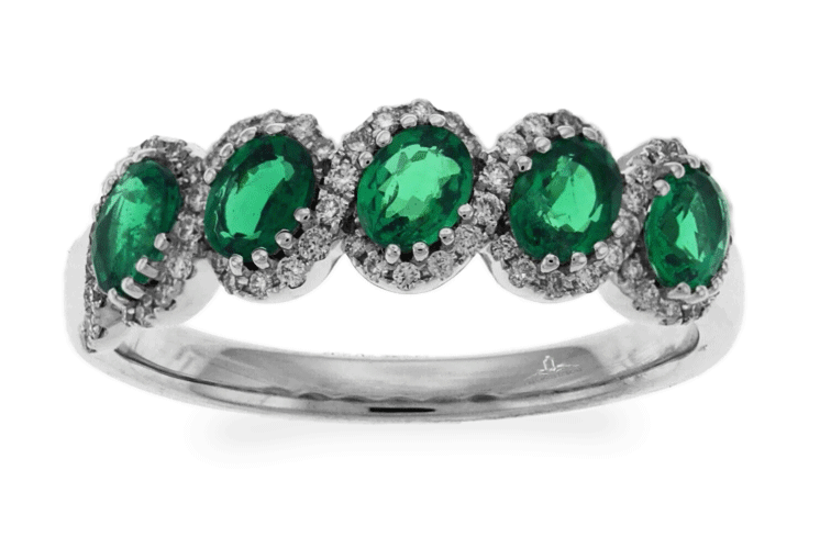 This Carnation Designs Signature’s ring features a collection of same quality of five oval shaped cut vivid green emeralds in center and surrounded by same quality of brilliant small round cut diamonds pave set in 18k white gold. It can wear for you perfectly at any time with any wardrobe forever!!!