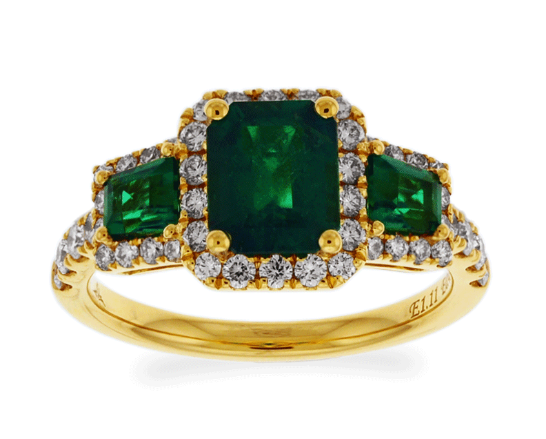 This stunning three stones emeralds ring features one emerald shaped cut lush green emerald in center with surrounding round-cut brilliant diamonds and one small trapezoid shaped lush emerald accented on each side in 18k yellow gold band. This ring is beautifully created by Carnation Designs and its Signature is on its shank. It will bring you to wear your treasure forever!!!
