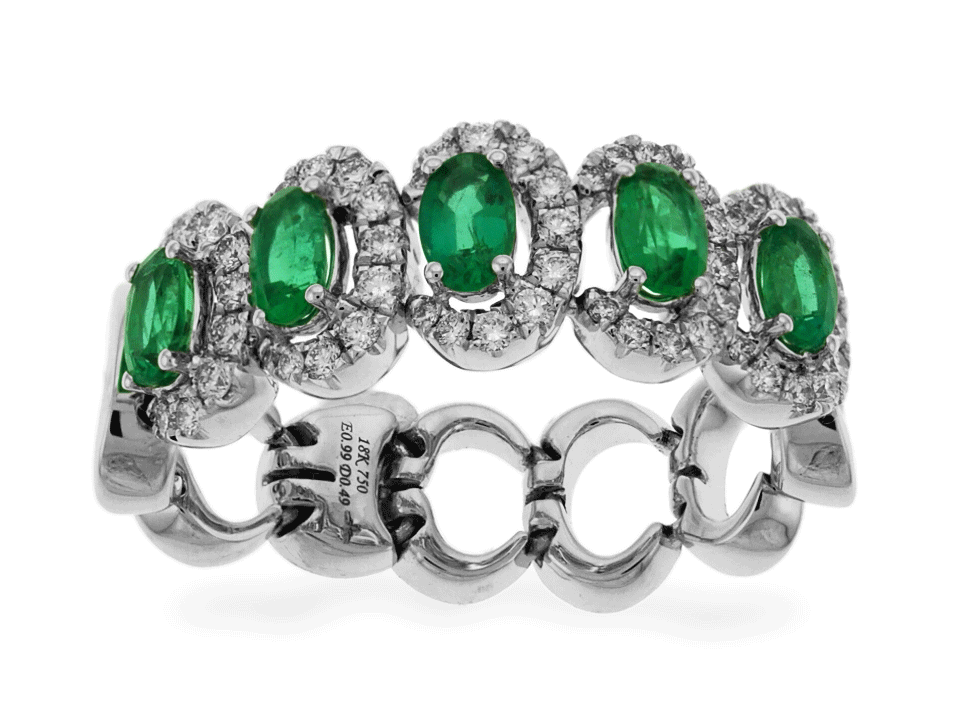This Carnation Designs Signature ring features a collection of same quality of five oval shaped cut vivid green emeralds in center and surrounded by same quality of brilliant small round cut diamonds pave set in 18k white gold. It will bring you to wear perfectly at any time with any wardrobe forever!!!