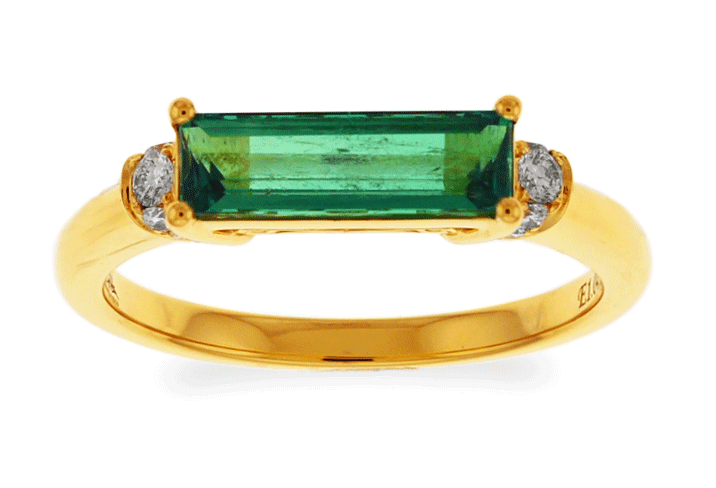 This stunning ring features an elegant micro- pave set of brilliant small round cut diamonds and a diligent style of emerald cut, the most radiant green emeralds, in the center. Carnation Designs Signature is burnishing on 18k yellow gold shank and it will bring you to wear at any time with any wardrobe forever!!!!!!