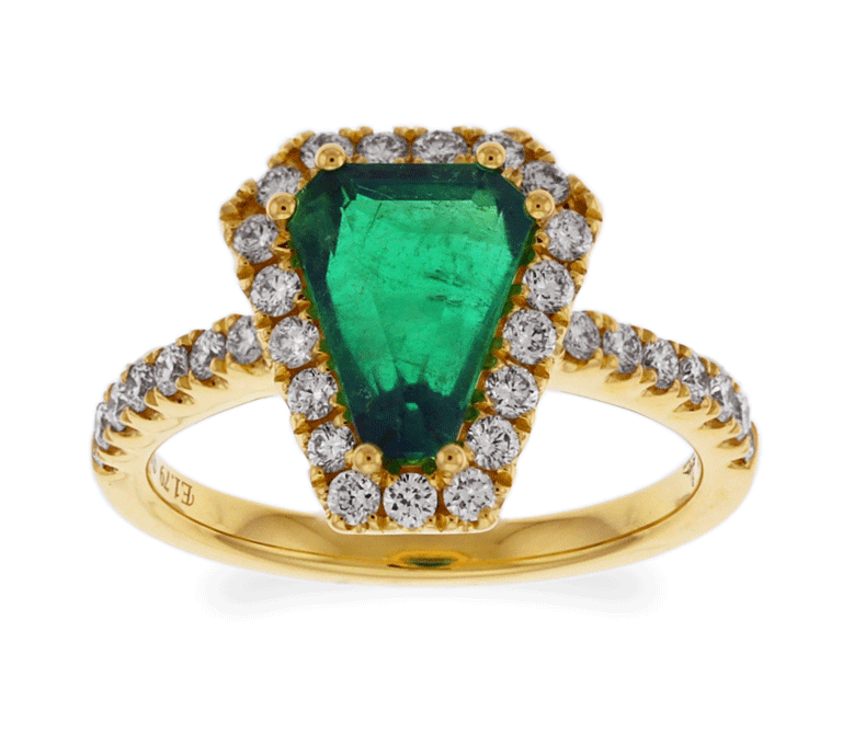 This stunning solitaire ring features the gorgeous verdant color of kite shaped cut emerald in center enclosed with small round cut sparkling diamonds pave-set in 18k yellow gold. This ring is proficiently created by Carnation Designs and its Signature is on its shank. It will bring you to wear at any time with any wardrobe for your unique style.
