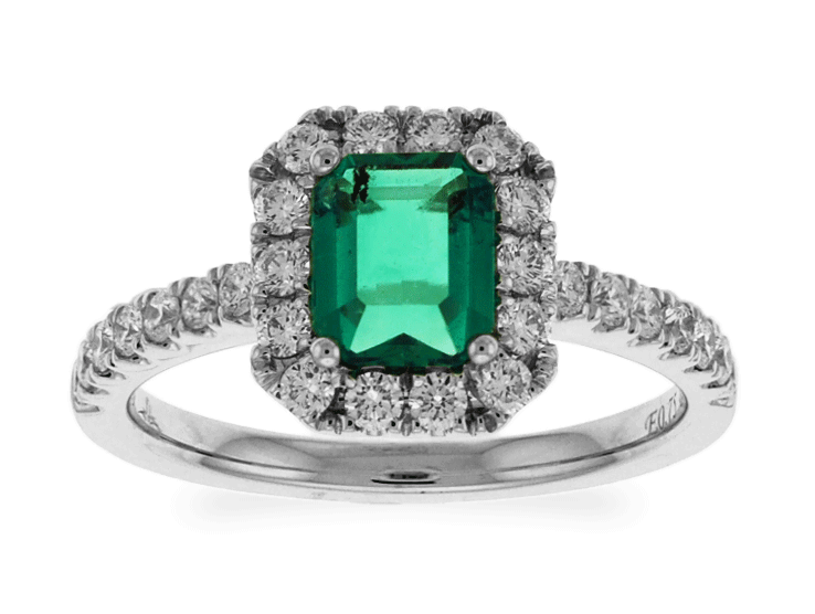 This fabulous solitaire ring features the gorgeous verdant color of emerald cut emerald at center enclosed with small round cut brilliant diamonds pave-set in 18k white gold. This ring is proficiently created by Carnation Designs and its Signature is on its shank. It will bring you to wear at any time with any wardrobe for your unique style.