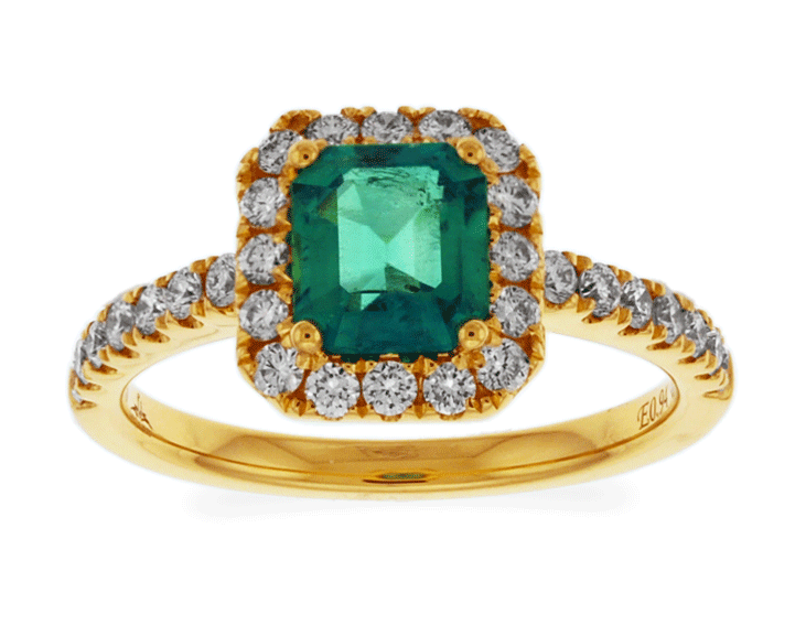 This fabulous solitaire ring features the gorgeous verdant color of emerald cut emerald at center enclosed with small round cut brilliant diamonds pave-set in 18k yellow gold. This ring is proficiently created by Carnation Designs and its Signature is on its shank. It will bring you to wear at any time with any wardrobe for your unique style.