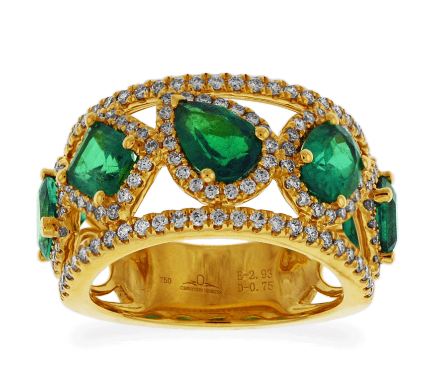 This stunning ring features the same quality of vivid green different shaped cut emeralds accented by brilliant small round shaped cut diamonds row with pave-setting. Carnation Designs Signature is beautifully pressed on 18k yellow gold. It can fix to wear at any timeĀ for a more glorious style.