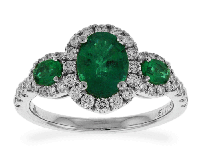 This stunning three stones emeralds ring features one oval shaped cut lush green emerald in center with surrounding round-cut brilliant diamonds and one small oval shaped lush emerald accented on each side in 18k white gold band. This ring is beautifully created by Carnation Designs and its Signature is on it. It will bring you to wear your treasure forever!!!