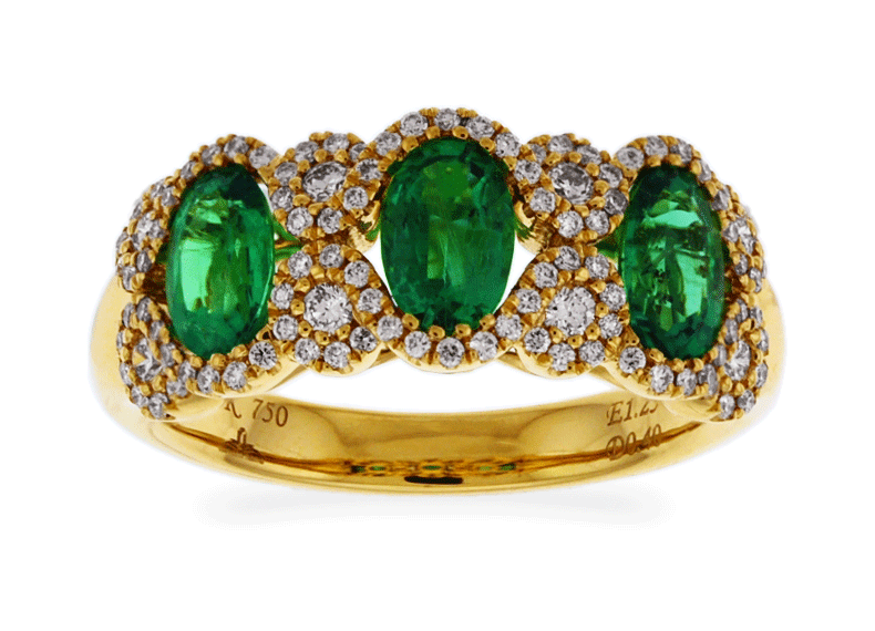 This Carnation Designs Signature’s ring features a collection of same quality of three oval shaped cut vivid green emeralds in center and surrounded by a beautiful design of brilliant small round shaped cut diamonds pave set in 18k yellow gold. You can wear any wardrobe at any time and it will bring your treasure forever!!!
