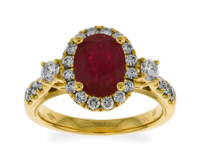 This fabulous solitaire ring features the most radiant red oval shaped cut ruby at center enclosed two round shaped cut with small round cut brilliant diamonds pave-set in 18k yellow gold. This ring is proficiently created by Carnation Designs and its Signature is on its shank. It will bring you to wear at any time with any wardrobe for your unique style.
