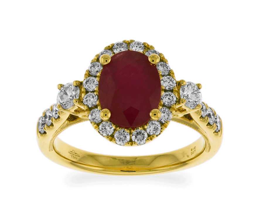 This fabulous solitaire ring features the most radiant red oval shaped cut ruby at center enclosed two round shaped cut with small round cut brilliant diamonds pave-set in 18k yellow gold. This ring is proficiently created by Carnation Designs and its Signature is on its shank. It will bring you to wear at any time with any wardrobe for your unique style.