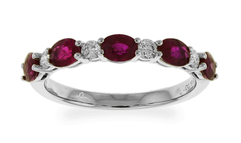 This classical style ring features a single row of alternating round-cut brilliant diamond and oval shaped cut the most radiant red ruby by accenting alternately. This ring sets a frame of pave-set precious stones going half-way around in 18k white gold band and Carnation Designs’ Signature is on its shank. It will bring you to wear with any wardrobe at any time.