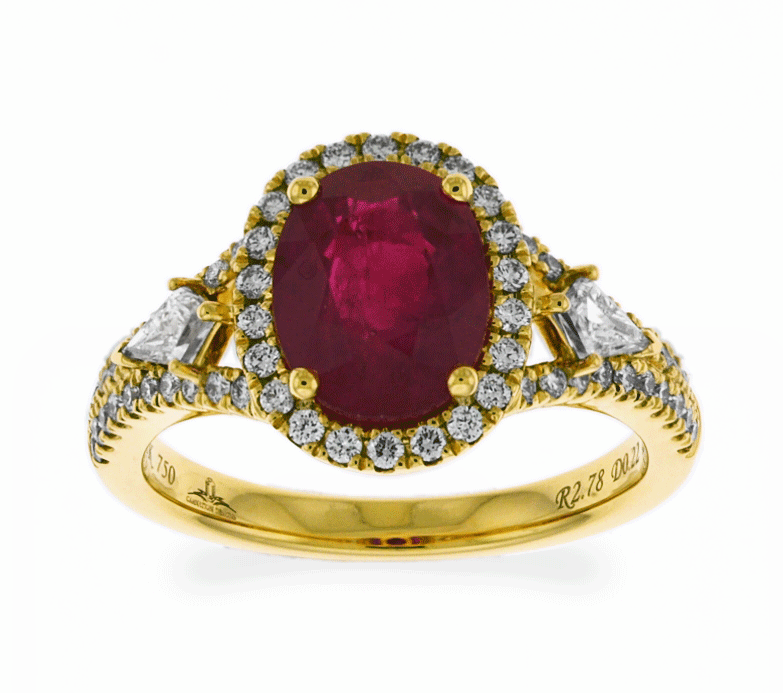 This gorgeous ring is made beautifully from Carnation Designs Signature. It features oval shaped cut purplish red ruby at center and the collection of same quality of kite shaped cut and small round cut brilliant diamonds pave set. This 18k yellow gold fashionable ring is for any wardrobe to add your loveliness and you will love to wear it forever!!!