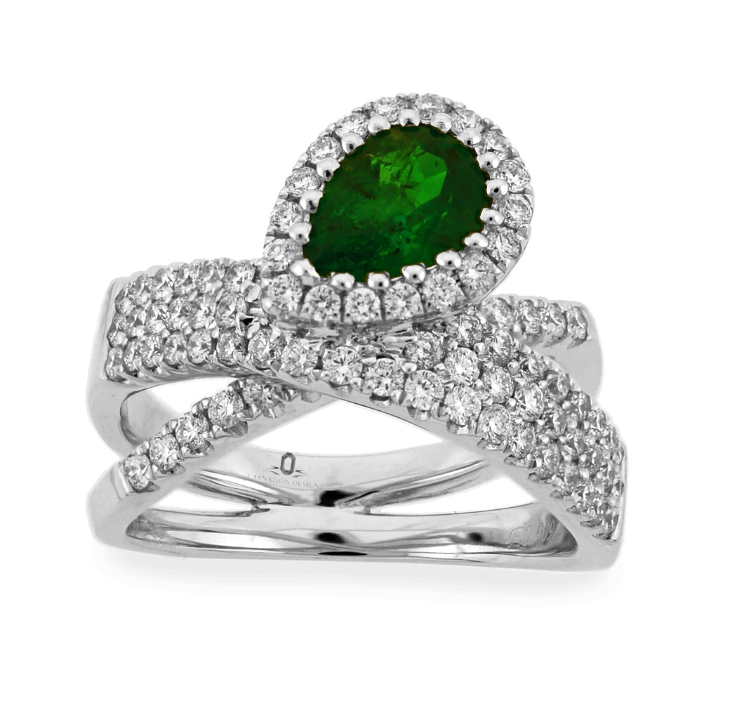 This luxurious ring features an elegant micro-pave set of brilliant diamonds and a meticulous style of pear shaped cut lush green emerald in center. It is surrounded by round cut brilliant diamonds rows on each side pave setting in 18k white gold. It is perfectly created by Carnation Designs and its Signature is on its shank.