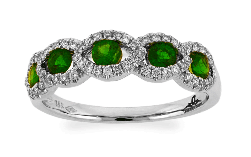 Carnation Designs Signature’s ring features six small round cut lush green emeralds surrounded by small round cut brilliant diamonds pave set as a stunning marquise shaped design. This beautiful 18k white gold ring is perfectly matched for the lady to wear any wardrobe at any time.