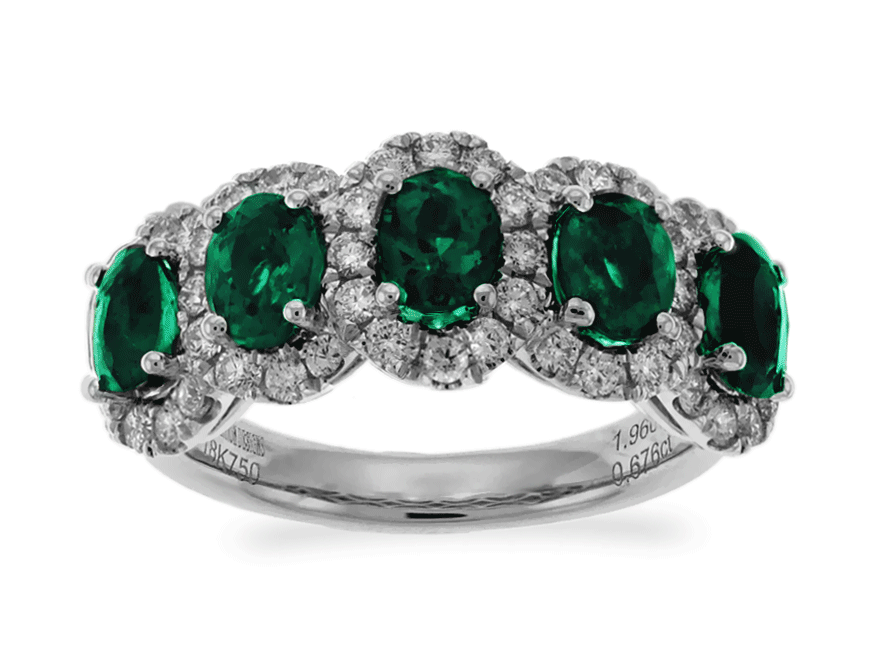 Carnation Designs Signature’s ring features five oval cut lush green emeralds surrounded by small round cut brilliant diamonds micro- pave set. This beautiful 18k white gold ring is perfectly matched to wear at anytime with any wardrobe. You will love to wear it forever!!!