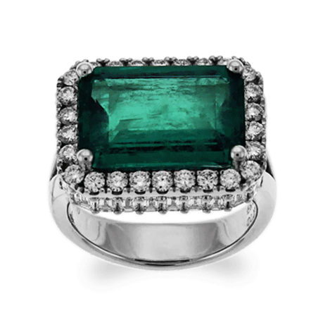 This gorgeous ring features an elegant micro- pave set of brilliant asher and round cut diamonds and a diligent style of emerald cut, the most radiant green emeralds, in the center. This stunning ring is created with 18k white gold. Carnation Designs Signature is burnishing on it and you will love to wear it forever!!!