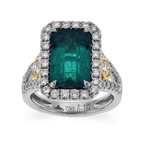 This stunning ring features an elegant micro-pave set of brilliant small round cut diamonds and fabulous style of emerald cut vivid green emerald in center. It is accented by small round cut brilliant diamonds on 18k yellow gold prong each side. It is skillfully created by Carnation-Designs and its signature is on 18k white gold. It will bring you to wear for your gorgeous style forever!!!