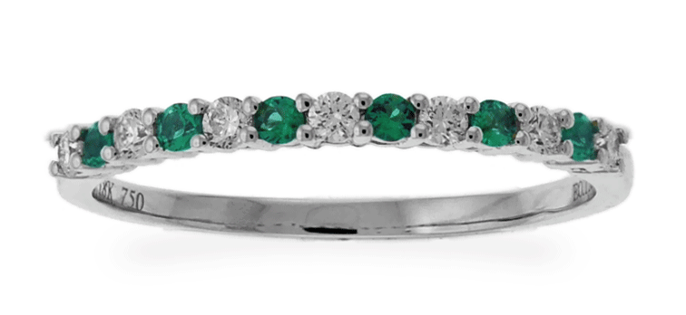 This classical style ring features a single row of alternating round-cut brilliant diamonds and vivid green emeralds. This ring sets a frame of pave-set precious stones going half-way around in18k white gold band with Carnation Designs’ Signature.