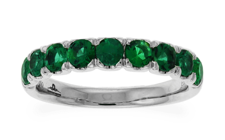 Rings Carnation Designs Signature’s ring features nine round cut lush green emeralds pave set. This beautiful 18k white gold ring is perfectly matched for the lady to wear any wardrobe at any time.