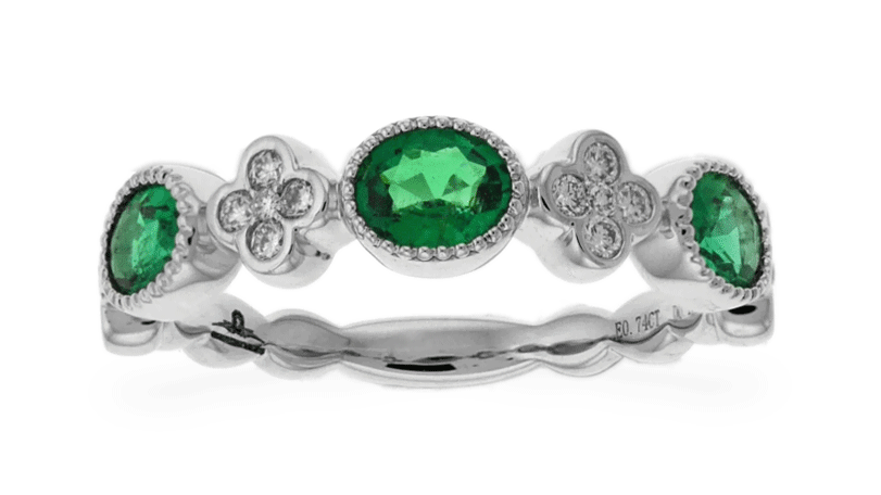 This lustrous ring features oval cut lush green emerald surrounding with a stunning flower shaped design with round cut brilliant diamonds in 18k white gold band. This ring is beautifully created by Carnation Designs and its Signature is on its shank.