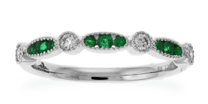 This classical style ring features a single row of alternating round-cut brilliant diamonds and a collection of small round cut vivid green emeralds as a shaped marquise alternately. This ring sets a frame of pave-set precious stones in18k white gold band and Carnation Designs’ Signature is on its shank.