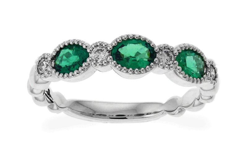This classical style ring features a single row of alternating round-cut brilliant diamond and oval shaped cut vivid green emerald by accenting alternately. This ring sets a frame of pave-set precious stones going half-way around in18k white gold band and Carnation Designs’ Signature is on its shank. It will bring you to wear with any wardrobe at any time.