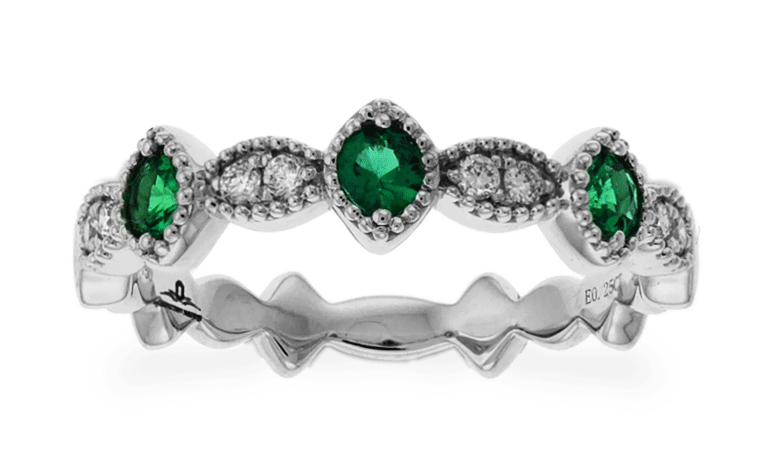 This classical style ring features a single row of alternating a collection of round-cut brilliant diamond as a shaped marquise designs and round cut lush green emerald is filled in the marquise shaped design alternately. This ring sets a frame of pave-set precious stones in18k white gold band and Carnation Designs’ Signature is on its shank.