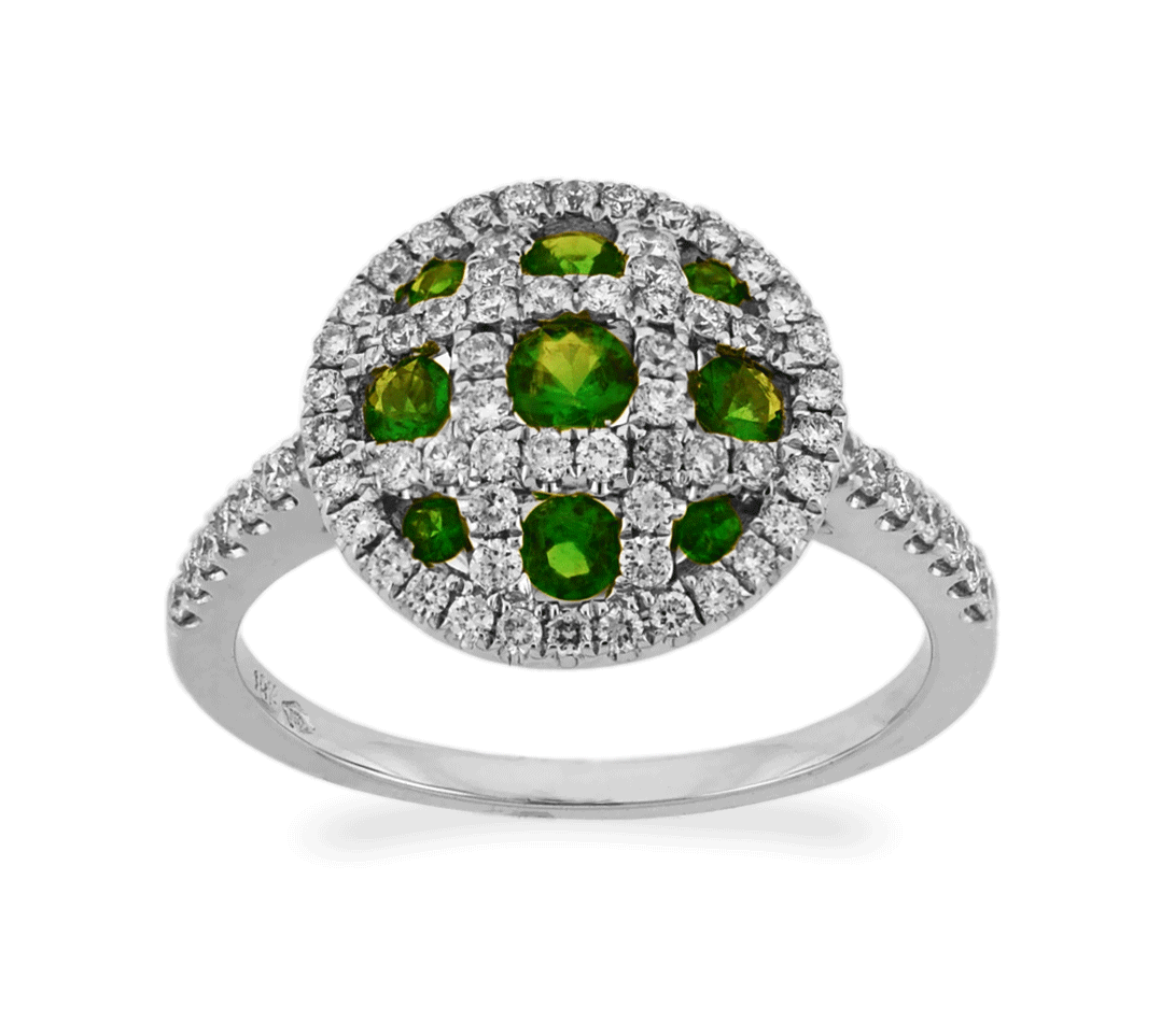 This stunning ring features the same quality of small round shaped cut lush emeralds as a button shape design that is surrounded by a small brilliant round diamonds pave set. Carnation-Designs’ Signature is burnishing on 18kw gold. It will bring you to wear it forever!!!